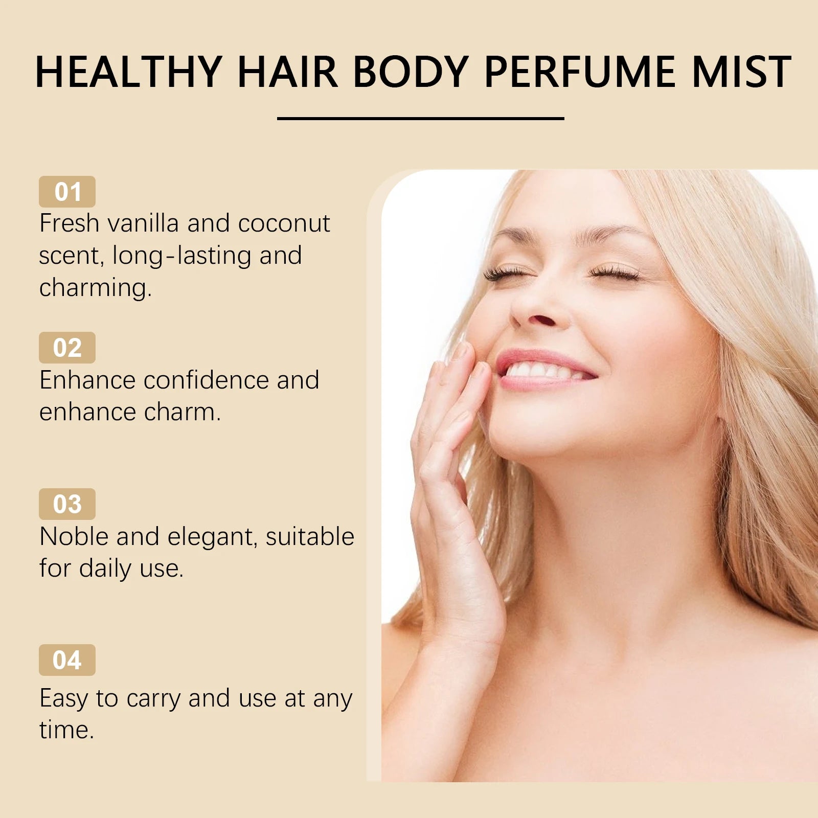 2. Press the spray head and spray the product on your hair, neck, wrists or other parts of your body.